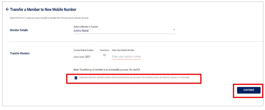 Beneficiaries can transfer a member form their account to a new mobile number.