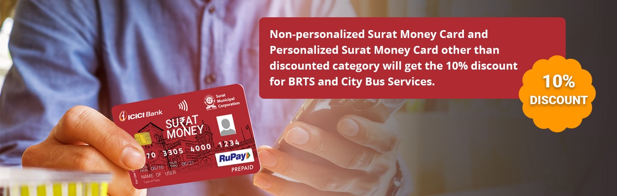 For any Non-personalized Surat Money Card and Personalized Surat Money Card other than category shown in above table will get the 10% discount for BRTS and City Bus.