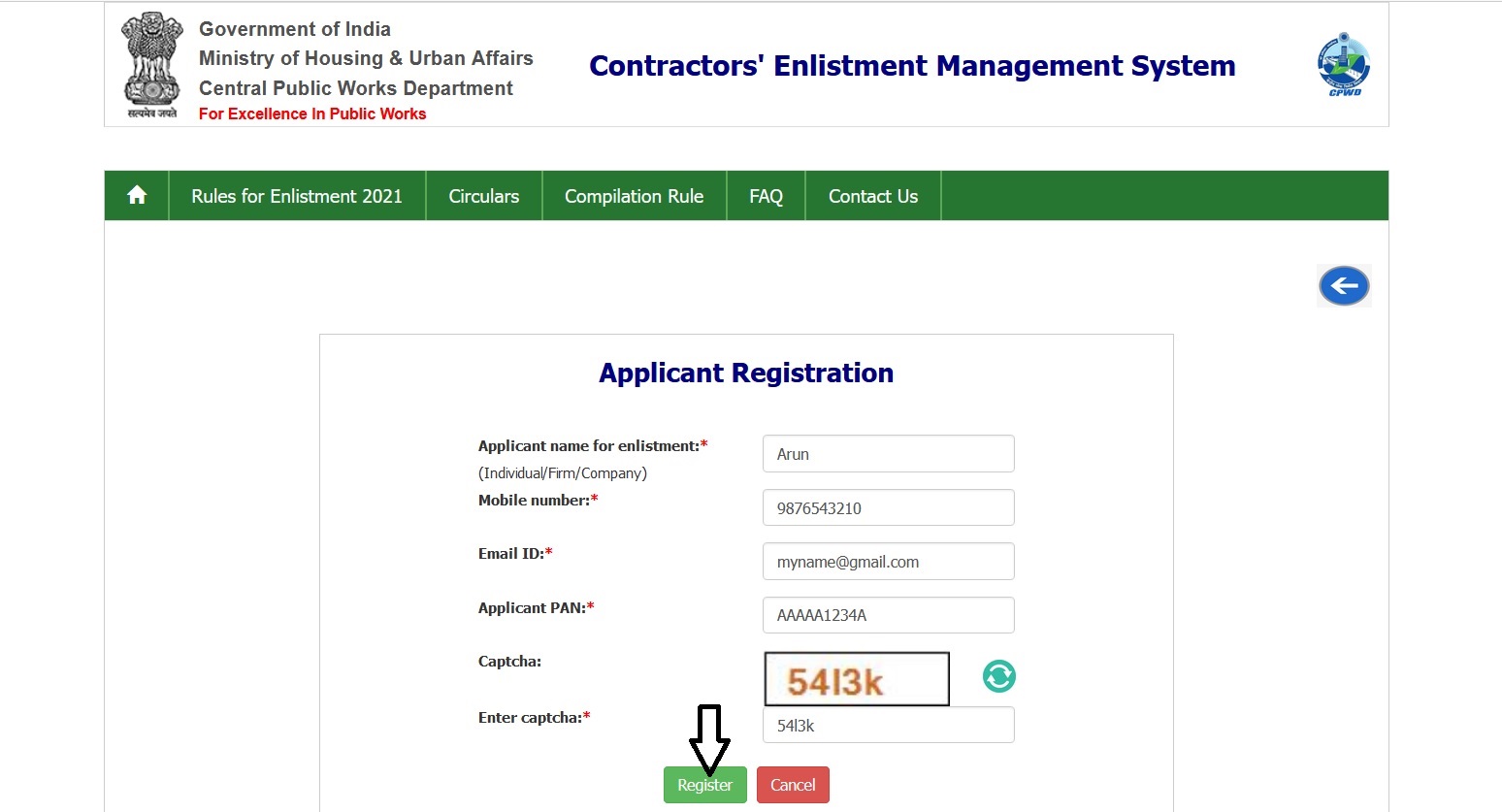 ** Contractor has to fill up details of Individual/Firm/Company in the Applicant name for enlistment.