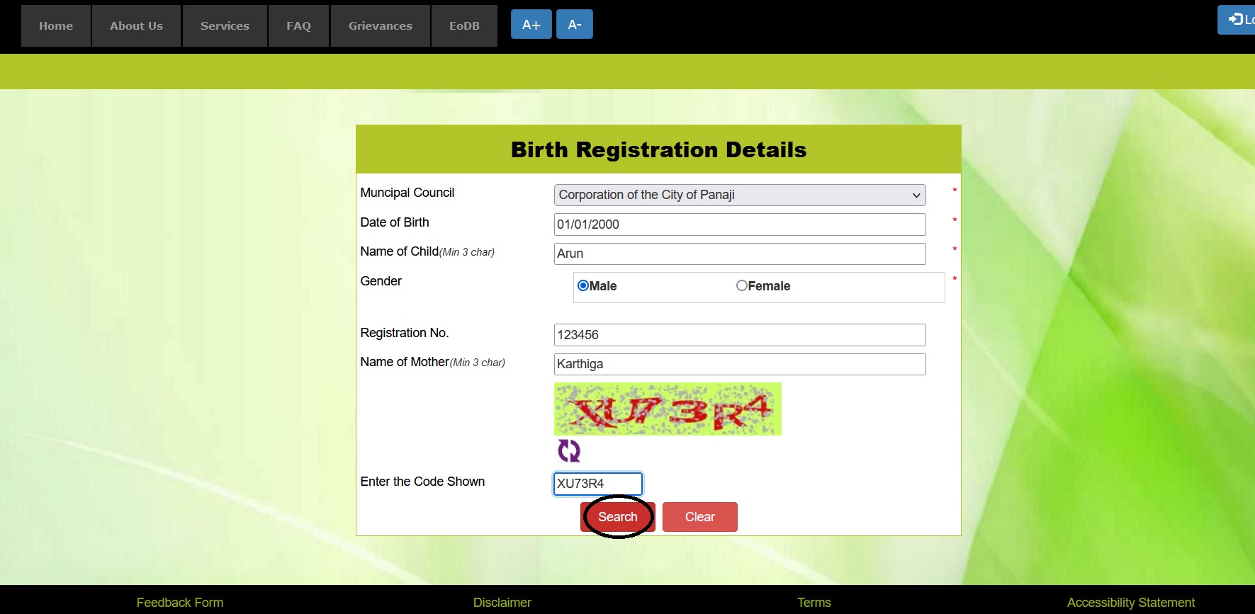 goaulbservice.gov.in Search Birth Registration Details : Goa ULB Service