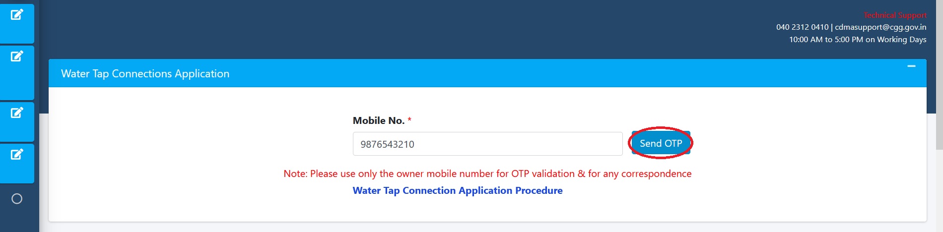 Step 1: Applicant has to go through the Mobile OTP Validation to access the New Water Tap Connection Application Form