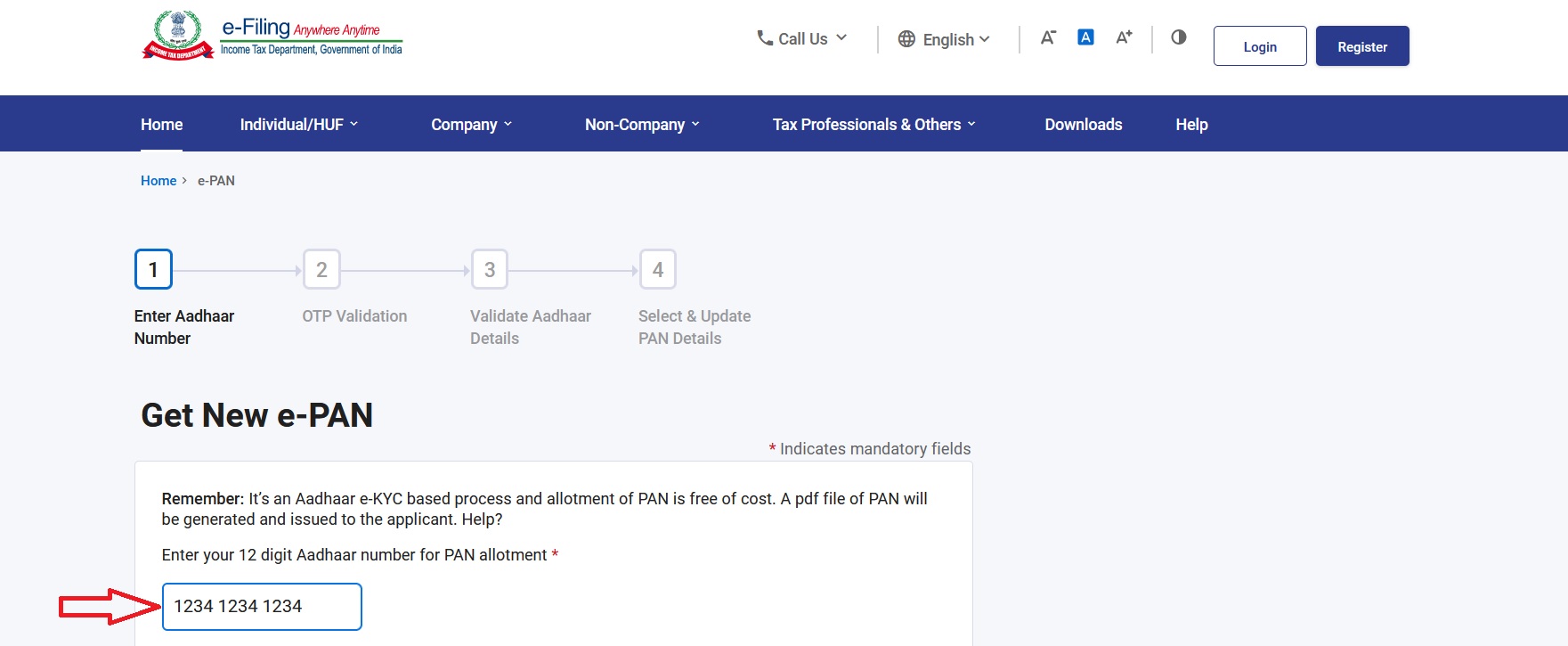 It is mandatory to quote your Permanent Account Number (PAN) while filing your Income Tax Return. If you have not been allotted a PAN, you can generate your e-PAN with the help of your Aadhaar and a mobile number registered with your Aadhaar. Generating e-PAN is free of cost, online process and does not require you to fill up any forms.