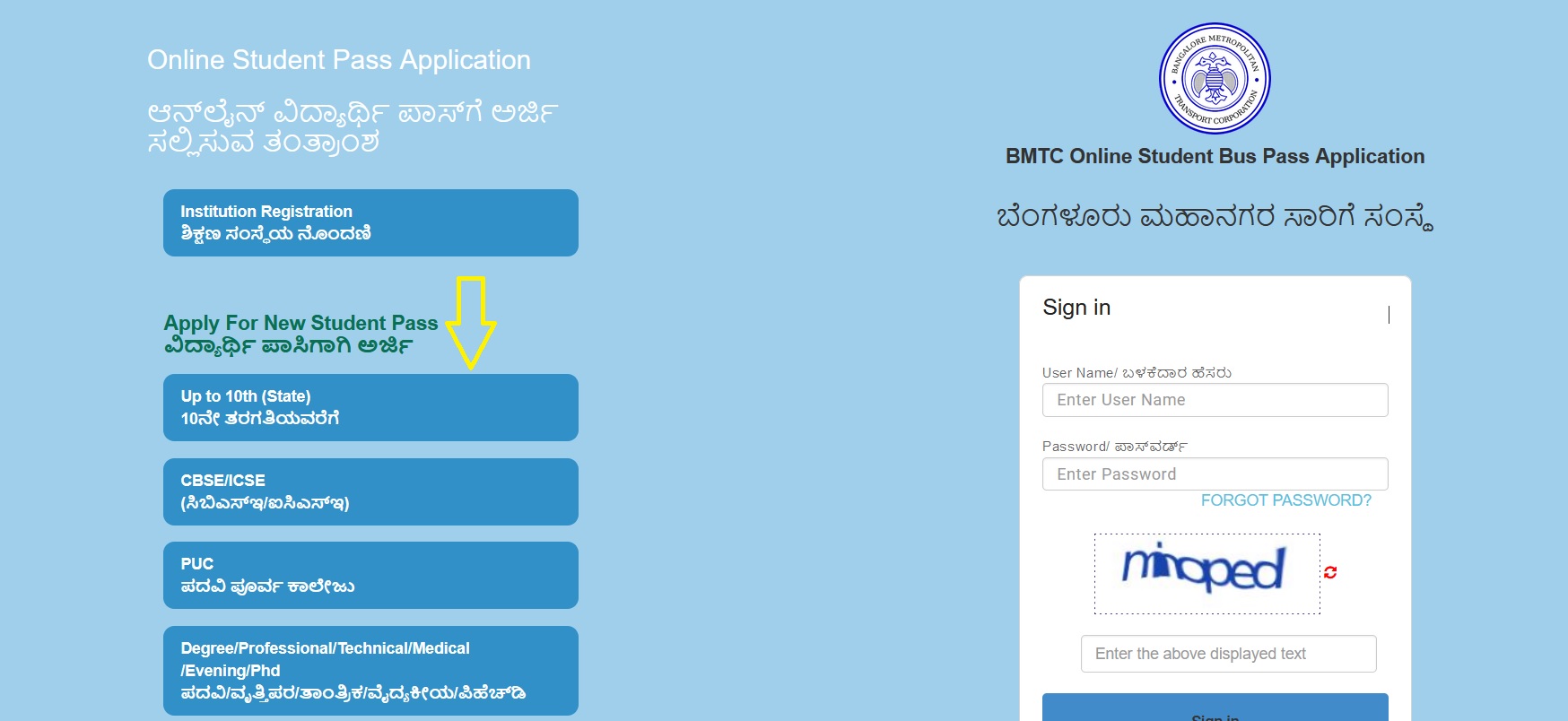 Visit https://mybmtc.karnataka.gov.in for online application. Click on “online student pass application”. Once the main page gets navigated to Student Pass page, kindly click on “Up to 10th(or)CBSE/ICSE (or)PUC (or)Degree/Professional/Technical/Medical (or)Special schools”
