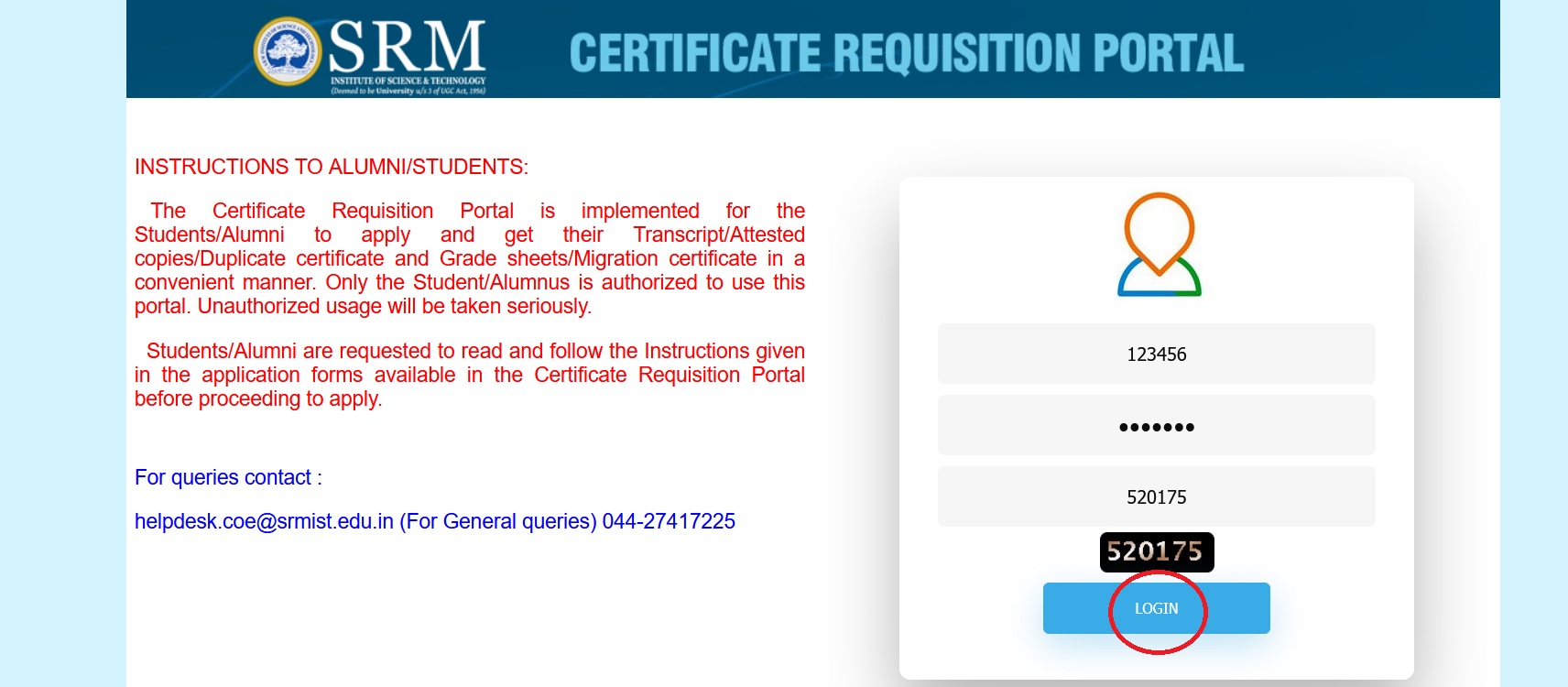 The SRM Institute Certificate Requisition Portal is implemented for the Students/Alumni to apply and get their Transcript/Attested copies/Duplicate certificate and Grade sheets/Migration certificate in a convenient manner. Only the Student/Alumnus is authorized to use this portal. Unauthorized usage will be taken seriously. Students/Alumni are requested to read and follow the Instructions given in the application forms available in the Certificate Requisition Portal before proceeding to apply.