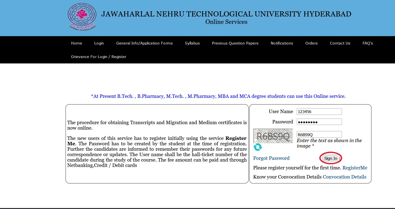 JNTUH Student Service Portal helps the applicants to apply online and to receive the transcripts at their door steps with a few mouse clicks.This service is enabled for users across the globe.