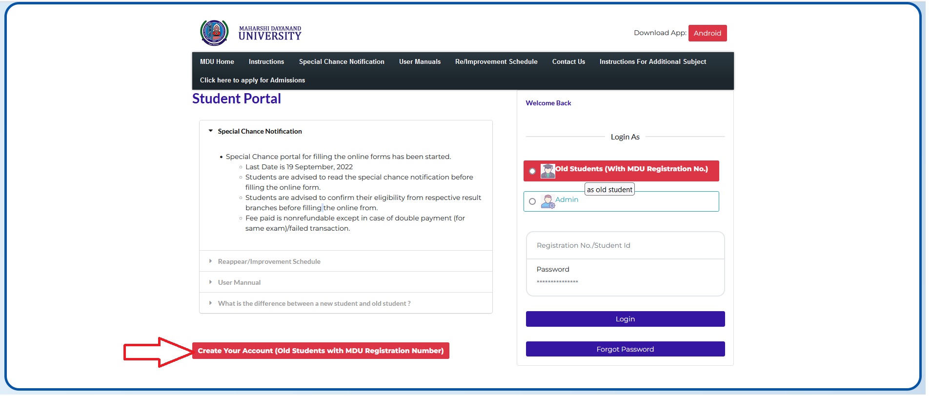 MDU Student Portal : Maharshi Dayanand University