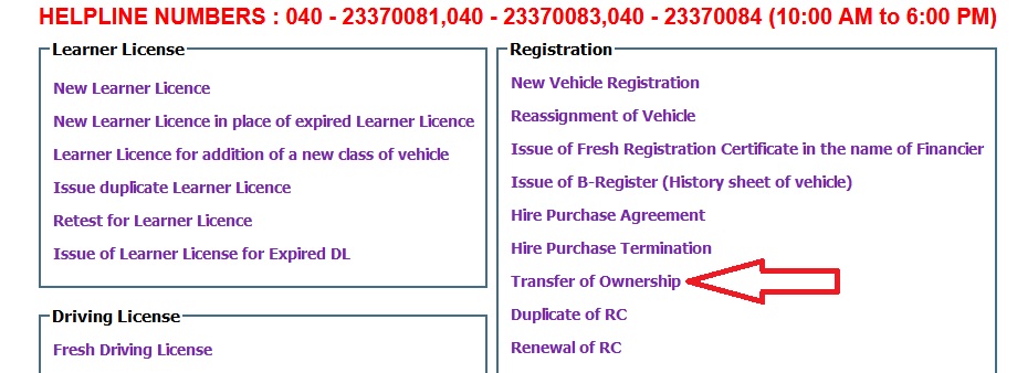 Go to the official website of Telangana Transport, click on the “Registration” tab in menu, then click on “Ownership Transfer” in sub menu list