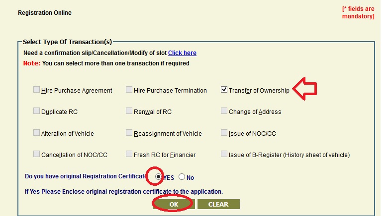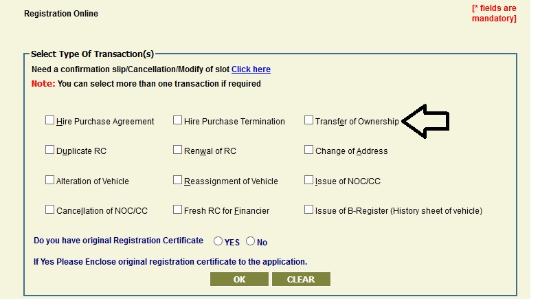 Select Type Of Transaction(s) “Transfer of Ownership” option,then select yes/No [Do you have original Registration Certificate]