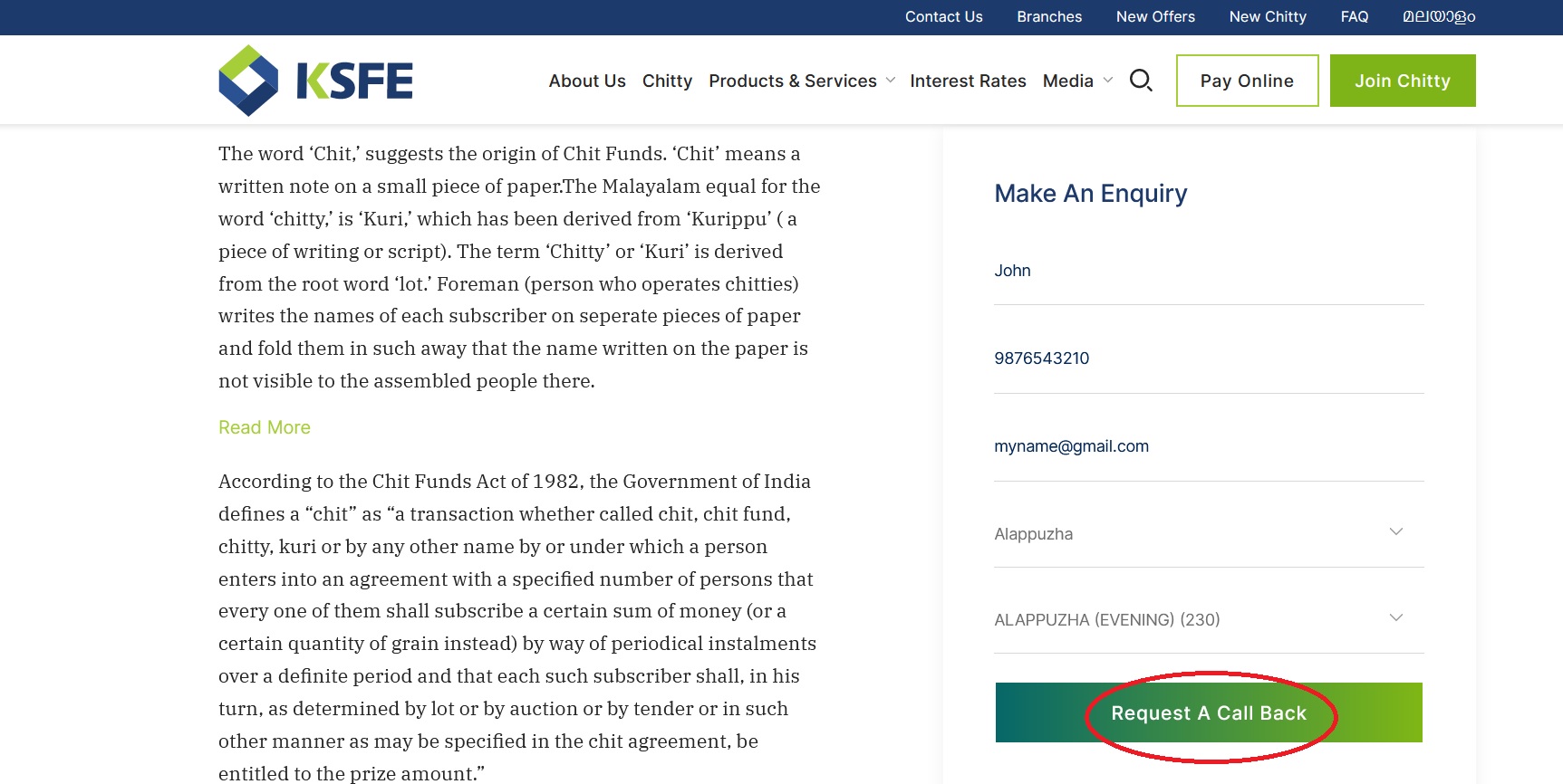 1. A person can enroll in a chitty either by visiting the Branch or through the agents of KSFE. You may either click the feed-back or directly ring to any one of the Branches which is nearer to your location.