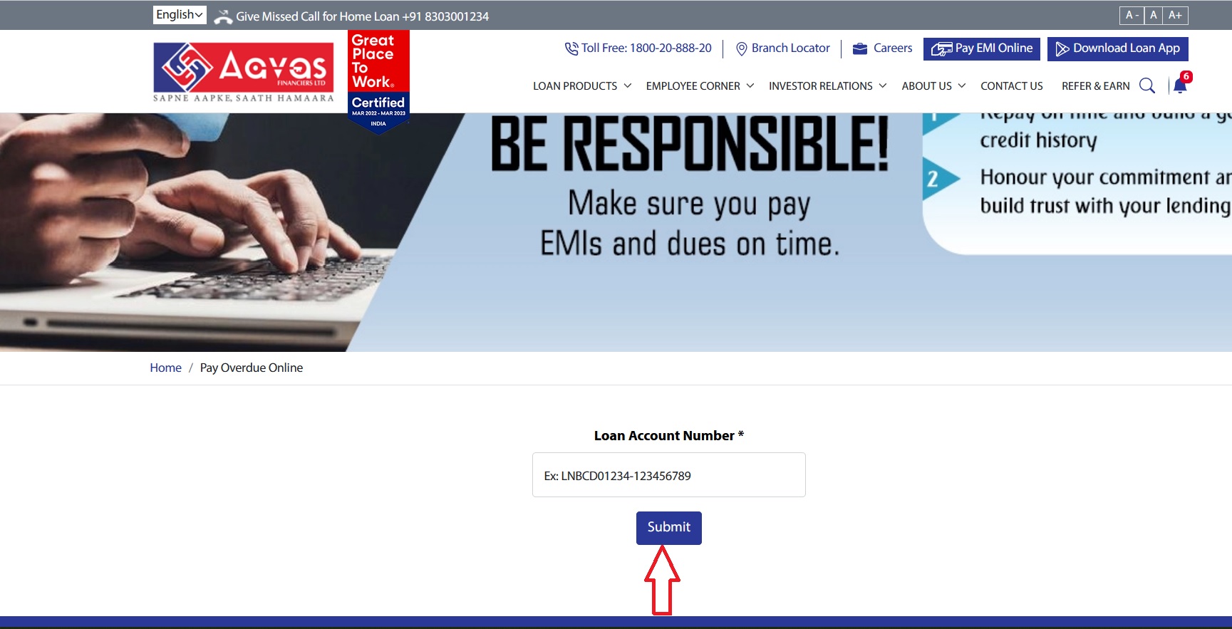 Step-1 : Go to the link https://www.aavas.in/pay-overdue-online