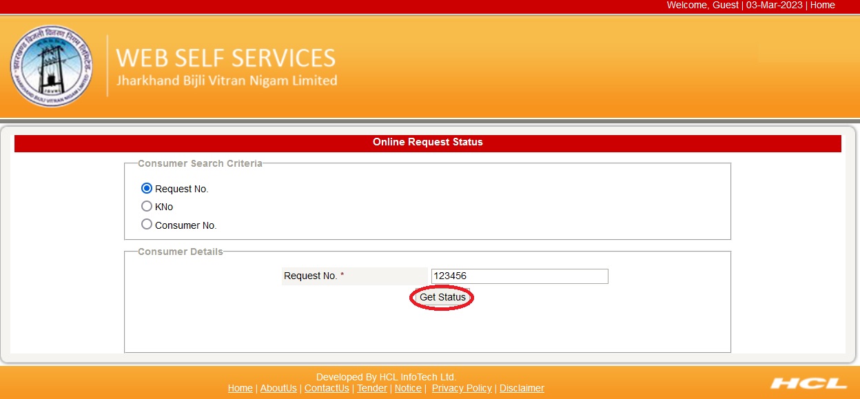 Step-2 : Enter the Request Number (or) KNo (or) Consumer Number
