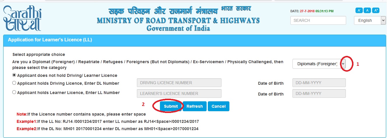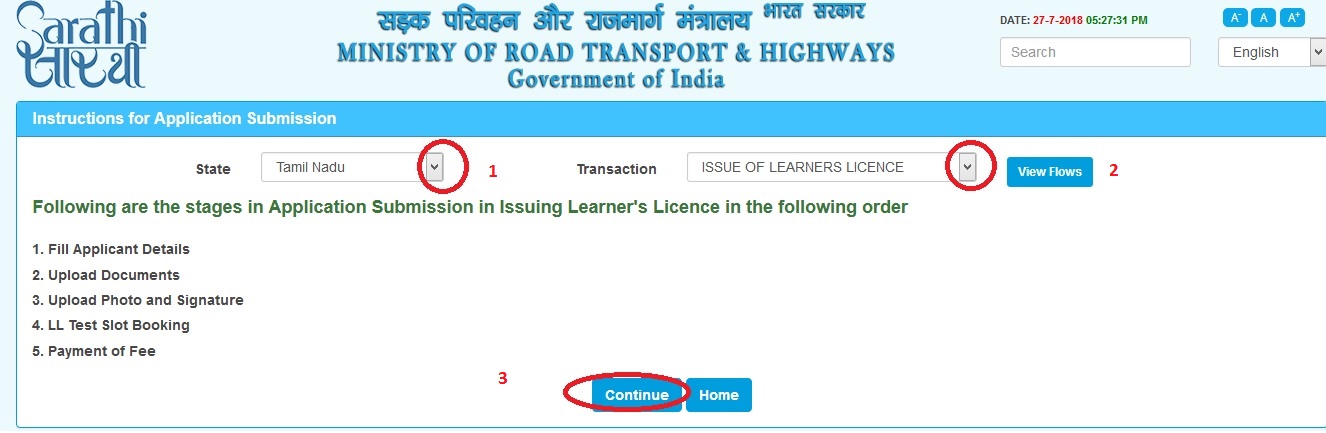 The following steps are to be followed for submitting the Sarathi New Learner’s Licence/Driving Licence :