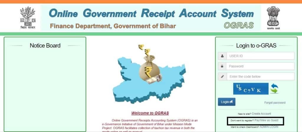 ** Log on for Bihar OGRAS Payments by using Login credentials or as guest users.