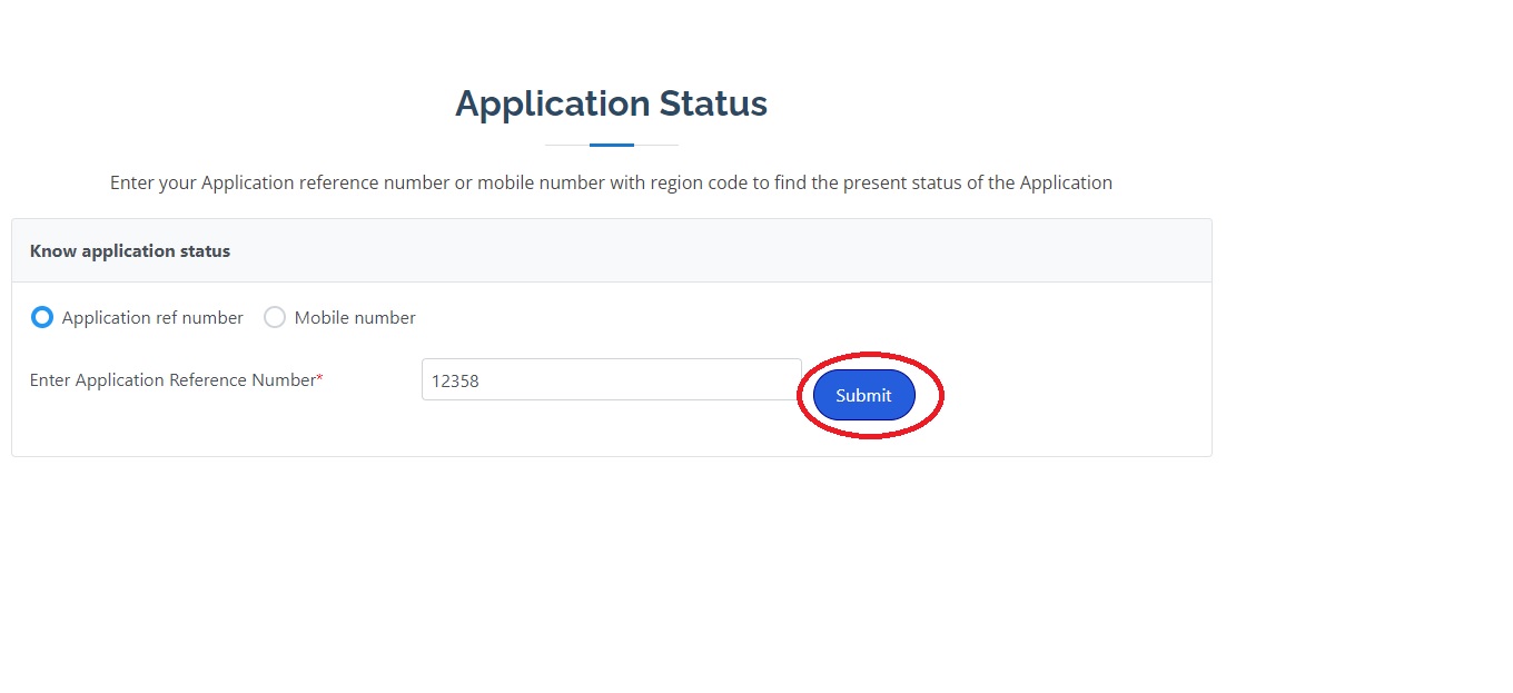 Steps 2 : Enter your Application reference number or mobile number with region code to find the present status of the Application