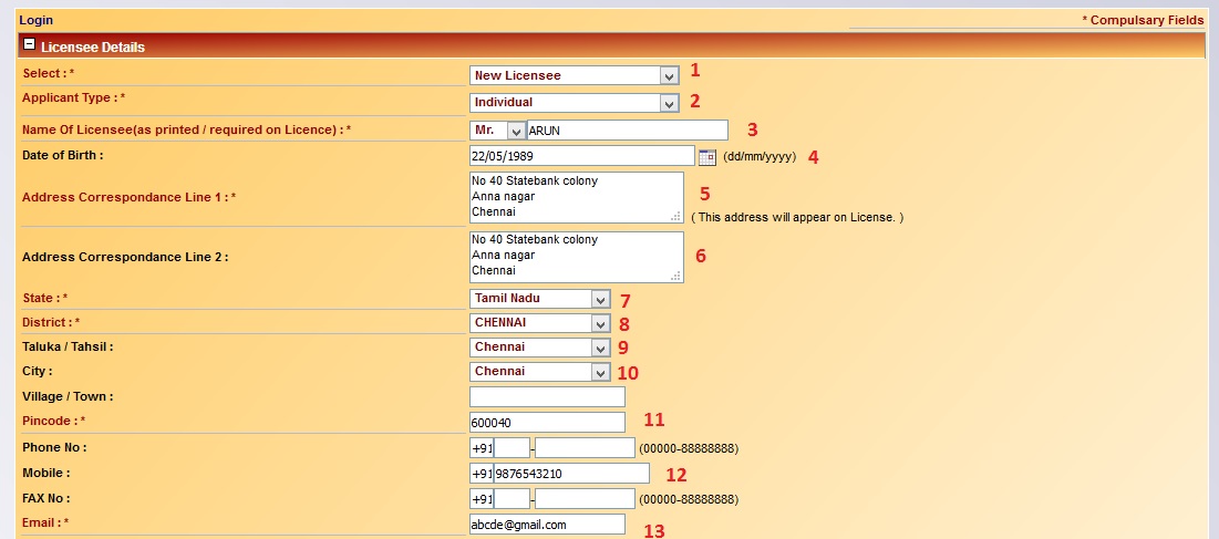 5. Enter Address Correspondance Line 1 * [No 40 Statebank colony,Anna nagar,Chennai ( This address will appear on License. )