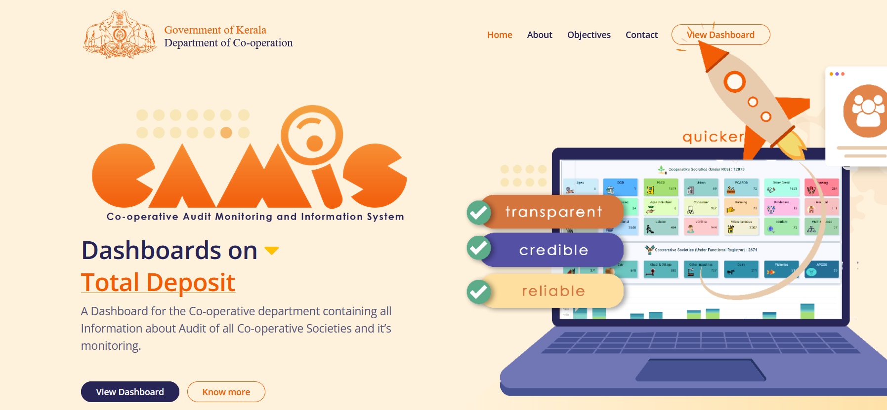 Co-operative Audit Monitoring & Information System (CAMIS) has been developed as part of the ICDMS project for the monitoring of co-operative audit progress and giving information to the members of the societies and to the public. It provides basic information and audit information of all Co-operative Societies in Kerala which are under the control of the Registrar of Co-operative Societies and other functional registrars.