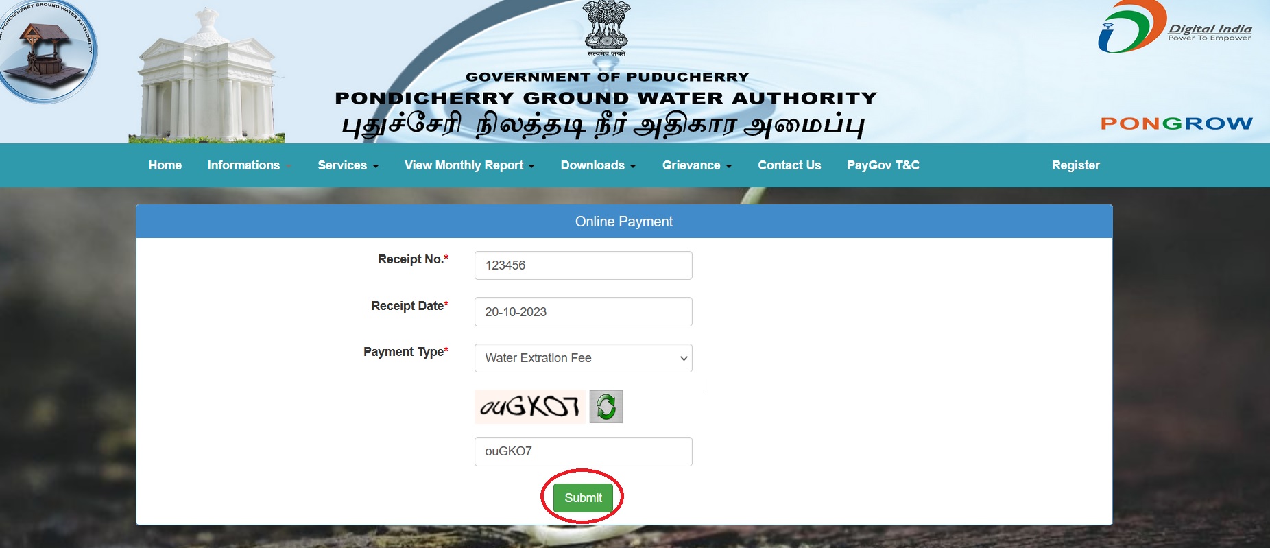 pgwa.py.gov.in Pay PONGROW Fee Online : Pondicherry Ground Water Authority