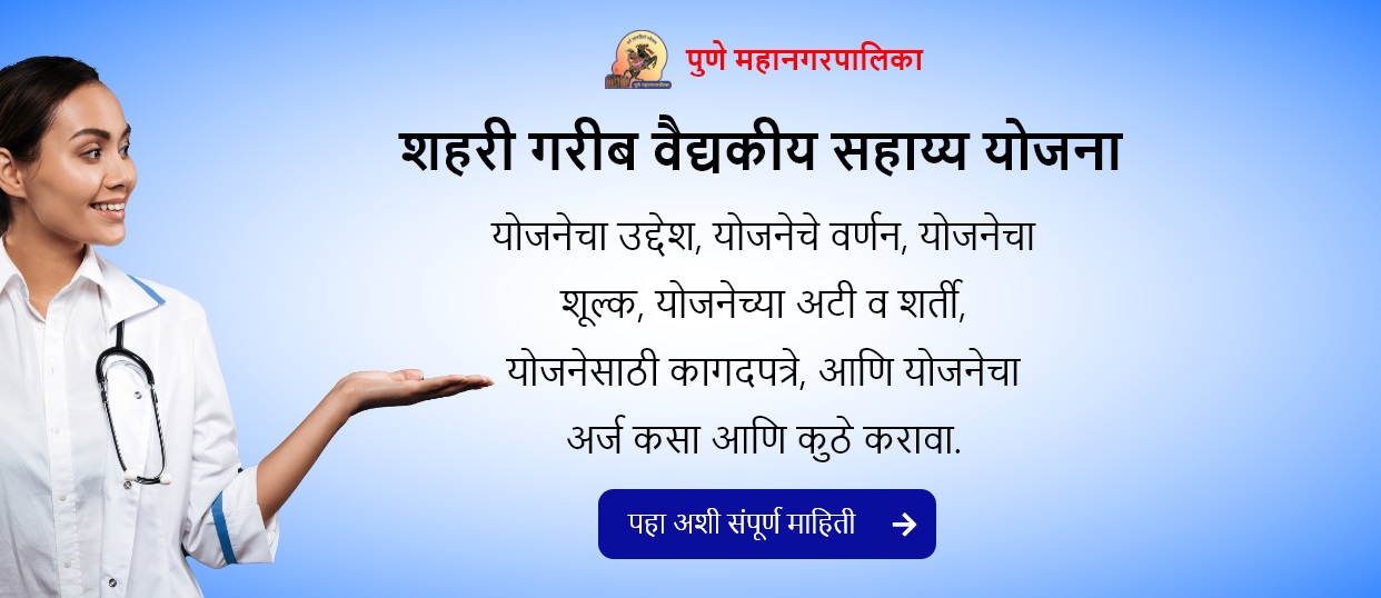 Urban Poor Medical Assistance Scheme is a Pune Municipal Corporation. Living in working area slums, Yellow ration card below the poverty line and annual family income Rs. Rs. Applicable for poor families up to one lakh Has been done. The Pune Municipal Corporation spends a maximum of Rs. 1 lakh per family for one year.