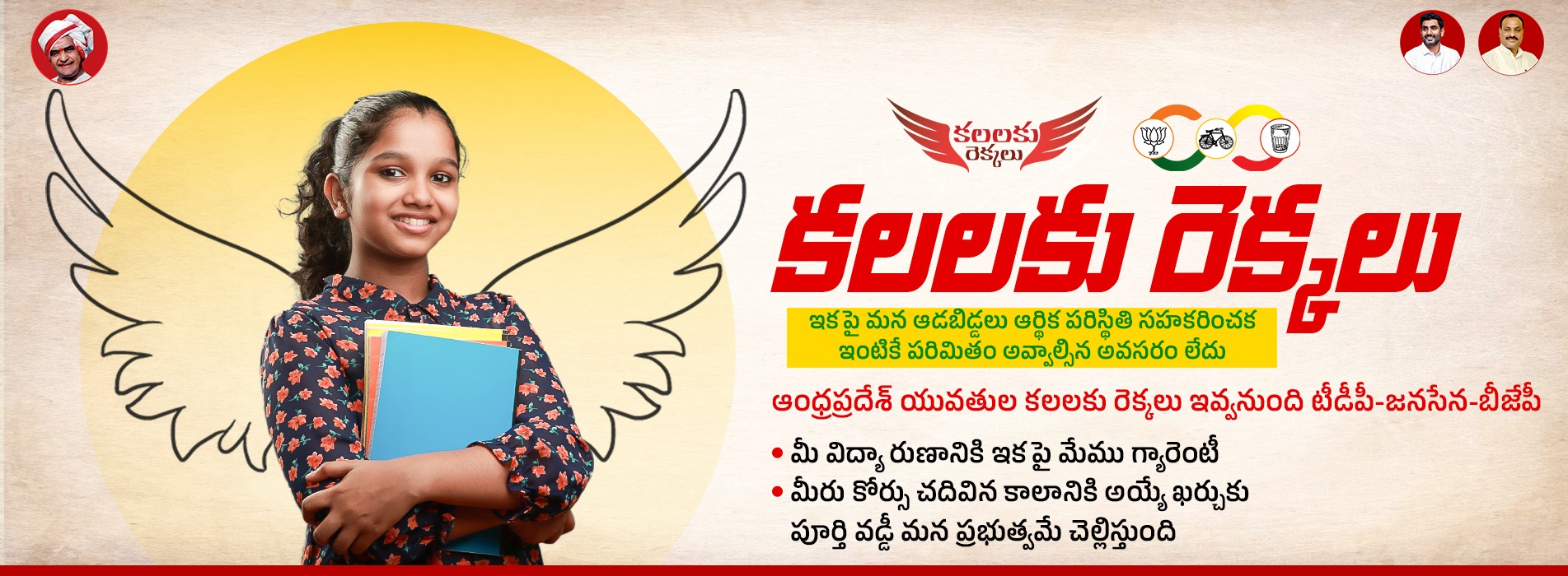 The Kalalaku Rekkalu Scheme is an initiative proposed by the TDP-JSP-BJP alliance in Andhra Pradesh to financially support women pursuing professional courses. Women who have completed Class 12 are eligible to register for the scheme. The registration process reportedly involved registering on the scheme’s website and receiving a certificate after registration.
