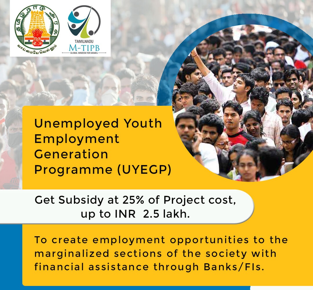 The Micro, Small and Medium Enterprises Department, Government of Tamil Nadu introduced the scheme “Unemployed Youth Employment Generation Programme (UYEGP)” which aims to mitigate the unemployment problems of socially and economically weaker sections of society, particularly among the educated and unemployed youth of the state.