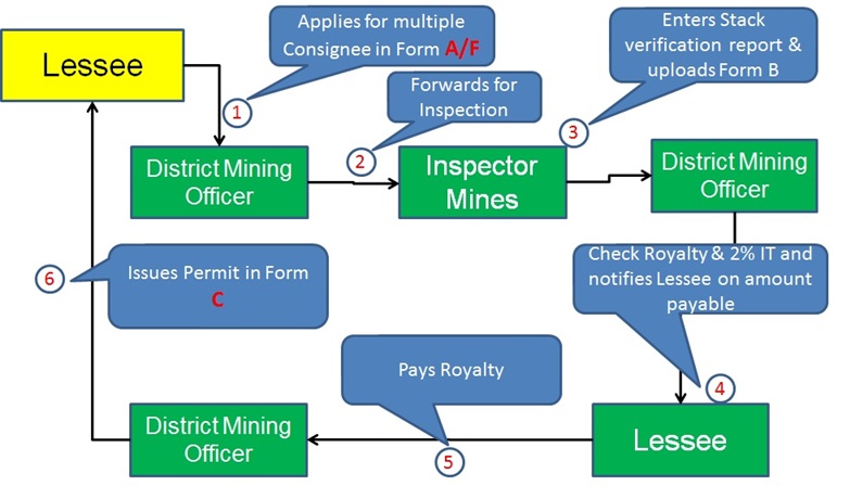 To start the ePermit system the Lessee after raising, proper dressing, stacking, grading and analysis of the mineral applies to the district Mining Officer (DMO) notifying their intention to remove mineral with details along with consignee & destination in Form A.
