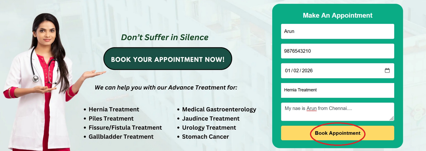 ** Enter your Name, Mobile Number, Date of Birth, Select Specialities & Enter the message and