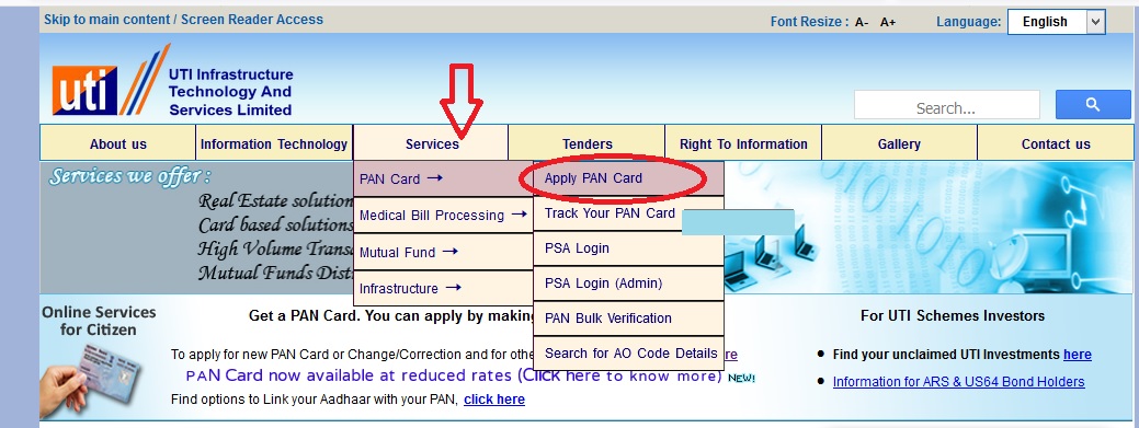 Go to the link of Apply Pan Card available in the home page as shown below.