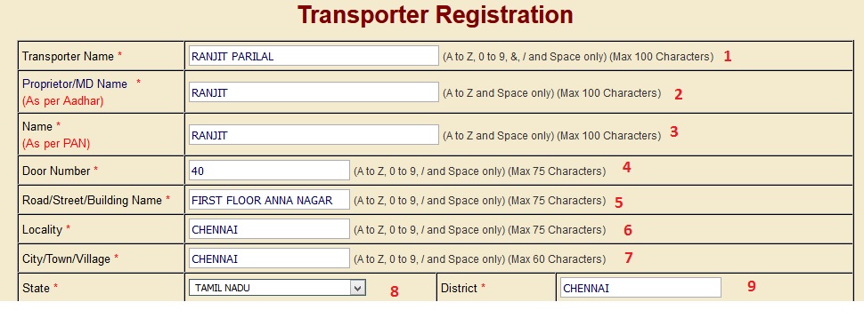 1. Enter Name of Transporter