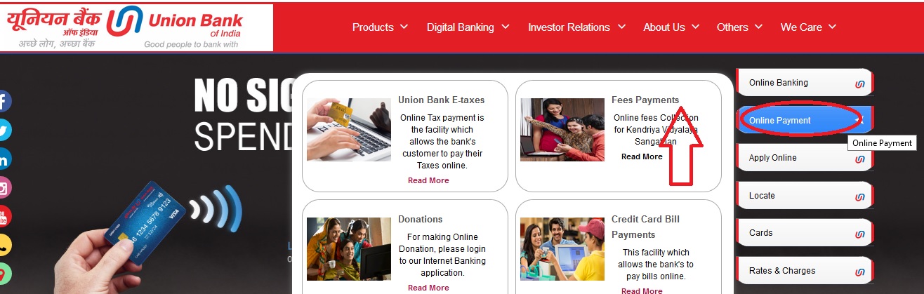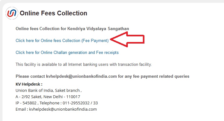 2. Online: Through Debit/Credit card or Internet Banking of any major commercial Bank by Logging in to the link provided on Union Bank of India website i.e. www.unionbankofindia.co.in or Kendriya Vidyalaya Sangathan website i.e. www.kvsangathan.nic.in.