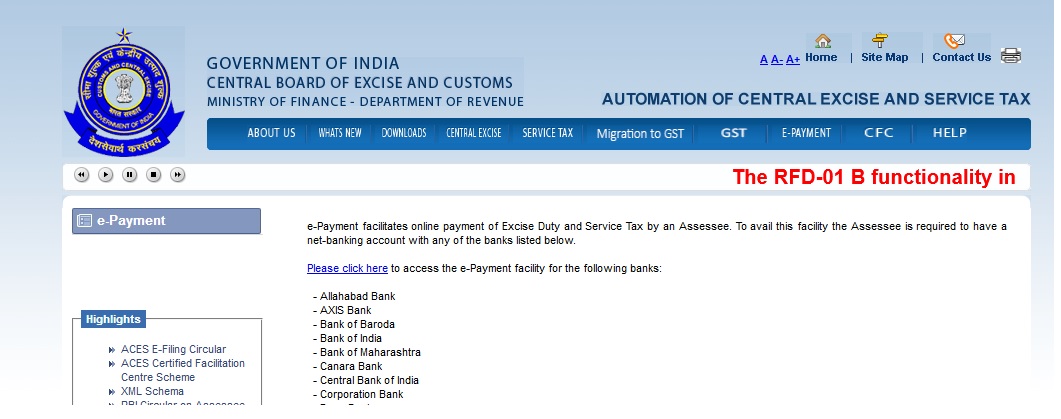 e-Payment facilitates online payment of Excise Duty and Service Tax by an Assessee.