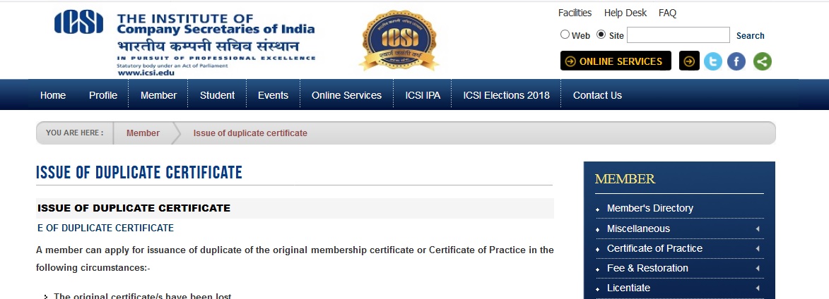 Website : http://www.icsi.edu/Member/Issueofduplicatecertificate.aspx